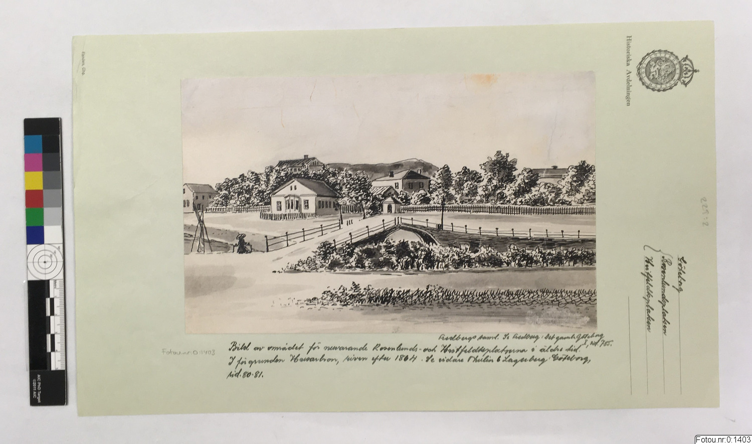Bild av området för nuvarande Rosenlunds- och Hvitfeldtsplatserna i äldre tid. I förgrunden Husarbron, riven efter 1864.