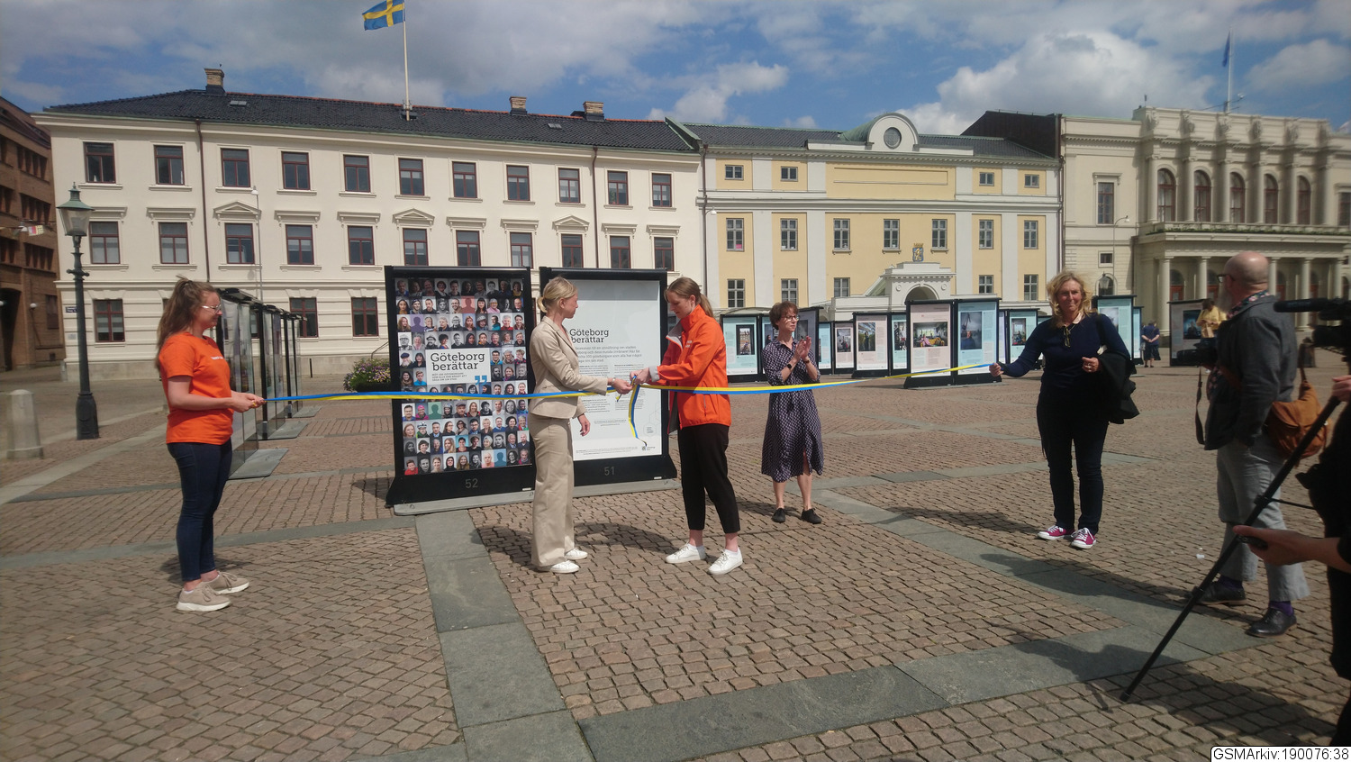 Invigning av utställningen på Gustaf Adolfs torg den 2 juni. På grund av Coronapandemin utan inbjudna, men invigningen filmades och sändes på sociala digitala medier. Från vänster till höger: Okänd, Sofie Berntsson från Göteborg o Co, Alexsandra Flinck - Göteborg o Co, Carina Sjöholm-museichef, Mari Wickerts -pedagog, två fotografer/journalister.