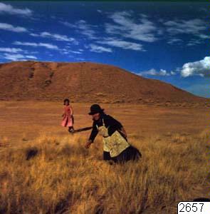 Aymara- eller colla-indianska flickor vid ruin- komplexet i Tiahuanaco.