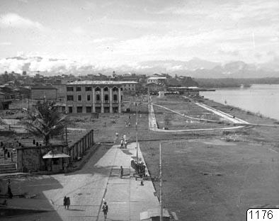 Utsikt över Buenaventura från Hotel Estación mot Västcordilleran av Anderna. Gatorna vid hamnen då under utläggning.