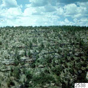 Utsikt över Walnut Canyon från plattformen vid museet i Walnut Canyon National Monument, under puebloperioden säte för sina qua- indianer. Se uppgifter till svartvita fotos på bildark 17835.
