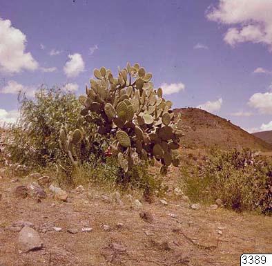 Utsikt mot Månpyramiden i Teotihuacán. Fikonkaktus; nopal av aztekiska nopalli, bot. Opuntia. Annat namn tuna.