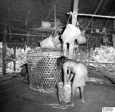 Kvinna med korgar för majsförvaring i hyddan tillhörig Aquerito Moña Membache vid Rio Puaró, Chocó.