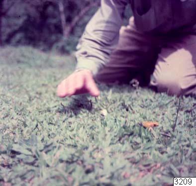 Giftgrodan söker fly undan solvärmen och hoppar i gräset.