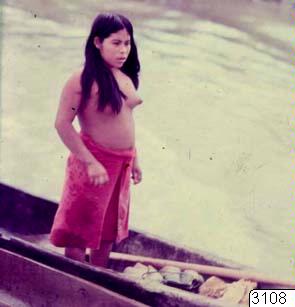 Waunana-chocókvinna bogseras i kanot under Bettys gång uppför San Juan. Iklädd paruma.