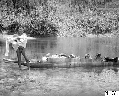 No(a)namá-Chocóindianen Tomás Hingimía vid kanoten lastad med etnografica efter
