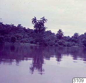 Flodlandskap med bla chontapalmer vid Rio San Juan, Chocó.