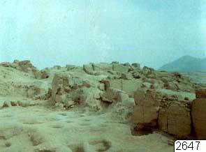 Murrester och parti av markplan. Jfr. sk. 2646 och 2648. Några av hålen i marken synliga på denna bild, bättre på 2648. Det är fråga om nedgångar eller öppningar till förrådskammare.