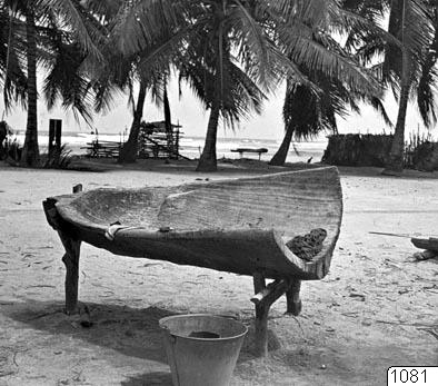 Del av gammal kanot gör tjänst som tvättkar. Obs. modern zinkspann bredvid. Småhusen vid stranden äro svinstior och avklädningshytter för kvinnor.