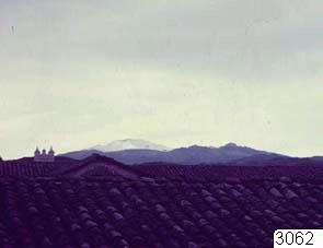 Vulkanen Puracé med snö sedd från Hotel Victoria, Popayán.