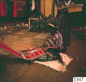 Pokoman (maya)-indiansk väverska från byn San Antonio Aguas Calientes i trädgården till Posada Belén, Antigua, Guatemala.