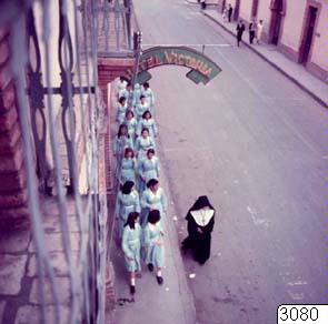 En nunna med skolklass passerar Hotel Victoria.