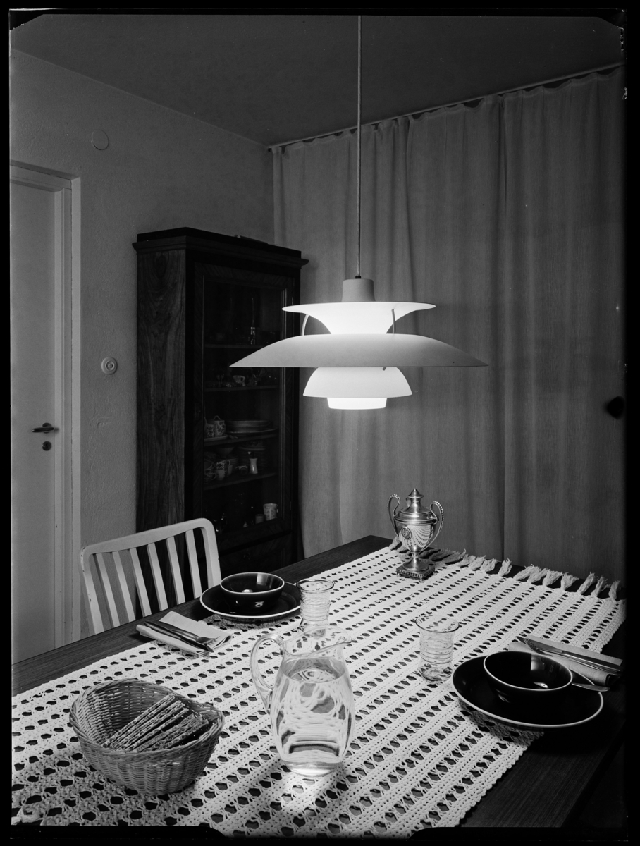 Titel: LISA BAUERS KÖK, DUKAT MATBORD MED LAMPA HOS HALD, DAM I ROTTINGFÅTÖLJ MED LÄSLAMPA
