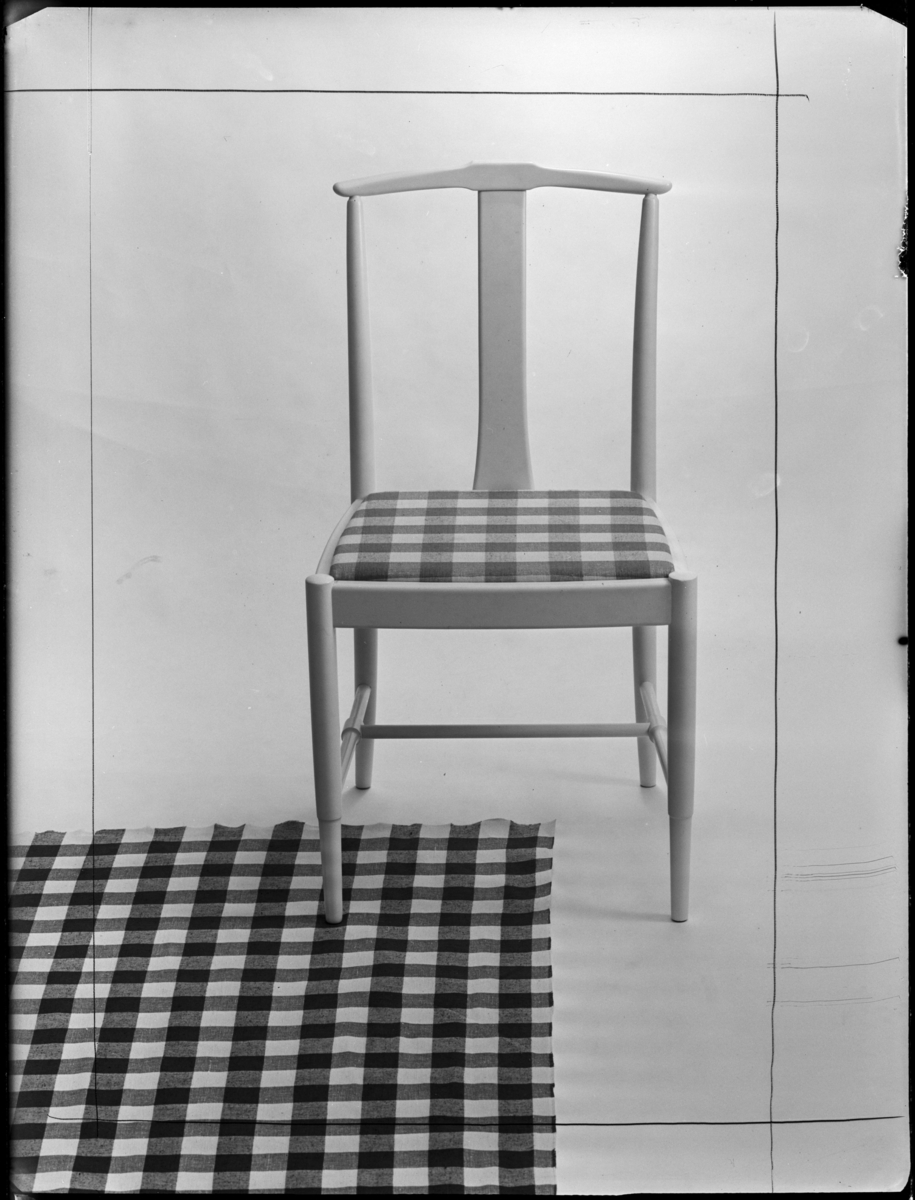 BRICKA PÅ RUTIG DUK, TRE RUTIGA TYGER, VIT GARDIN, STOL PÅ RUTIGT TYG