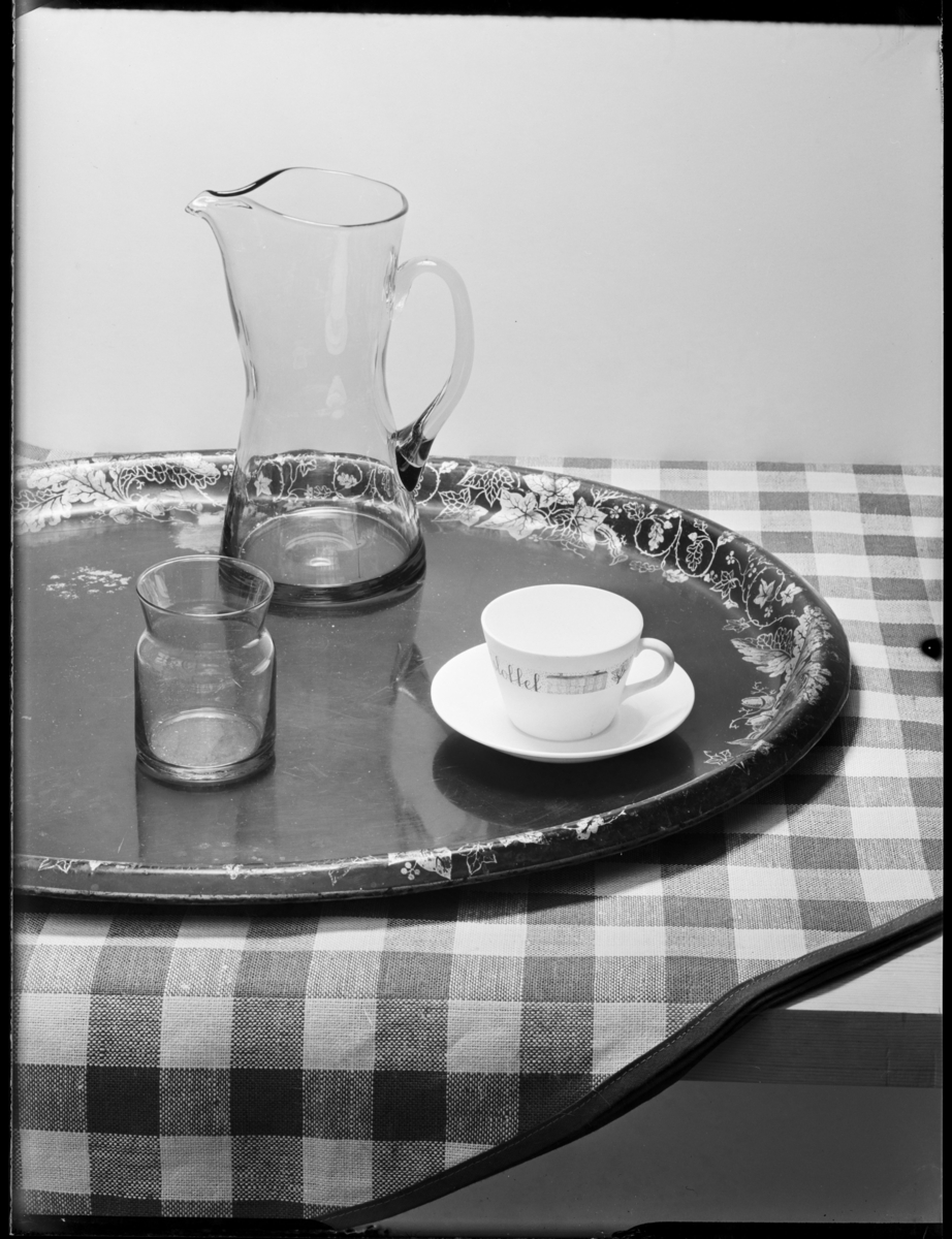 Titel: HEM I SVERGE BRICKA PÅ RUTIG DUK, TRE RUTIGA TYGER, VIT GARDIN, STOL PÅ RUTIGT TYG