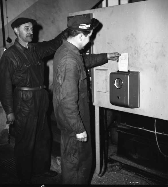 Arbetare i verkstaden på Forsviks bruk stämplar in för arbete.