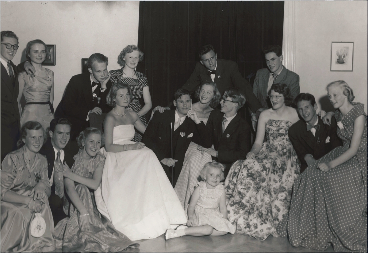 Skolavslutningsbal från flickskolan på Kungsgatan 30 i Varberg med av åtta par festklädda ungdomar (numrering personer se bild 2). De unga männen är klädda i kostym och kvinnorna har långklänningar. Nr 1 Roland Svensson; nr 2 Ingrid Wetterquist; nr 3 Stig Sandklef eller Gunnar Bramstång; nr 4 Ingegerd Ergardt; nr 8 Åke Johansson; nr 9 Anita Willert (Wilbert?); Kerstin "Sassa" Sjöström; nr 11 - Bendix; nr 12 Ann-Ida Evers; nr 14 Sonja Söhrman; nr 16 Britta Sandklef; nr 17 flickan Kristina Söhrman.