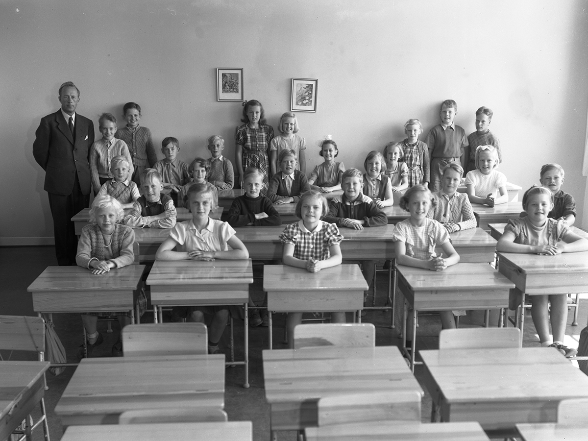 Längst till höger står Curt-Arne Lernsten och flickan i rutig klänning intill honom heter Gun Johansson. Flickan som sitter två bänkar fram åt vänster från Gun heter Ingrid Linnér. Vid tavlorna står Berit Strannegård Nyberg till vänster och Gun-Britt Bengtson till höger. Främre raden från vänster: Anna-Lisa Karlsson, Elvy, Britt Svensson, ?, Siv Andreasson. Rosmarie Olsson sitter näst längst bak till höger, i ljus klänning. Leif Persson sitter i bakre raden som nr 2 från vänster (barnbarn till Oscar Persson, "OP").