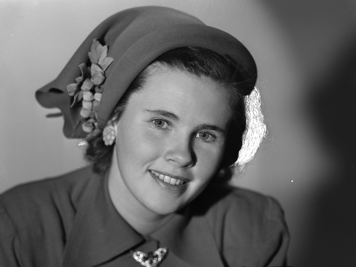 Reklamfotografering med ung hattmodell för Bergströms Modeaffär, hattar. (Flickans hår har retuscherats på höger sida.)