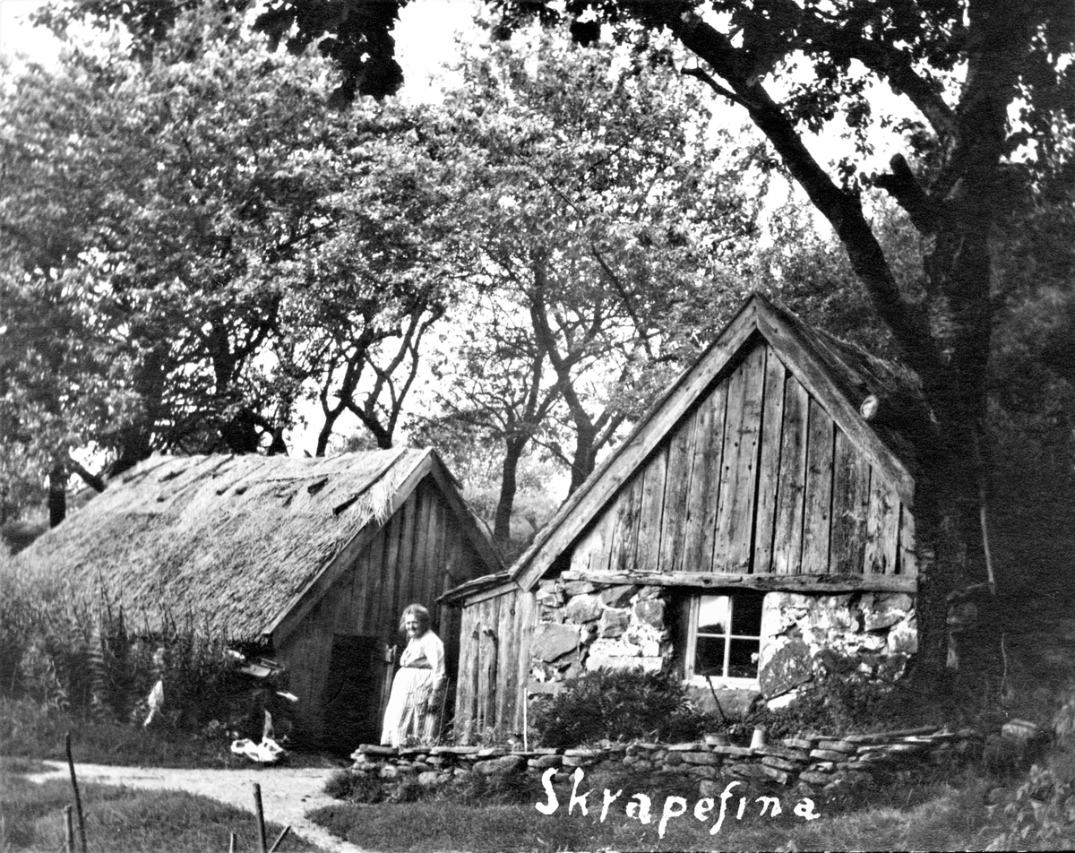 Anna Josefina Gabrielsdotter, Skrape-Fina kallad, vid sitt hem i Dagsås. Hon föddes 1865 den 19 april. I backstugan till höger bodde hon med sin egen familj och huset till vänster fungerade som ladugård. Fina fick åtta barn, varav två inom äktenskapet åren 1891-1897 med Gustaf Karlsson (1839-1897), övriga fäder var "okända" och två av barnen dog som små. Sitt sista barn fick hon som 53-åring år 1908. Yngste sonen Hugo bodde kvar med henne i backstugan tills hon dog 1957.
