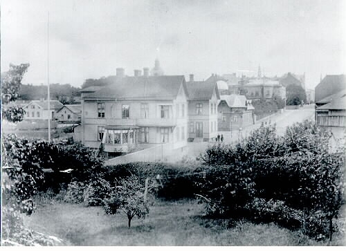 Bäckgatan mot öster, innan järnvägen 1920 fick sin rakare sträckning söderut. Första huset t v, var först hyreshus i början på 1900-talet och kallades Hedinska huset. Därefter hade en herr Silvander matservering där, som revs när järnvägen anlades där. Andra huset är Gerlachska stallarna och därefter bostadshuset från 1891 (revs 1977). Huset som skymtar t h är Missionskyrkan. I förgrunden ses trädgården till fastigheten Fästningsgatan 3 som togs ned på 1960-talet.