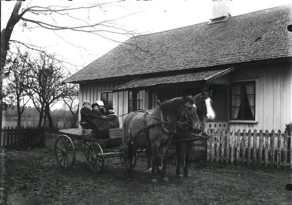 Från vänster: Lennart, Sten, Dagmar och Sture födda Gustafsson. Hästarna heter Gulli och Lova. Stensered, Drängsered. Huset har en farstukvist med snickarglädje. (Se även bild HB52)