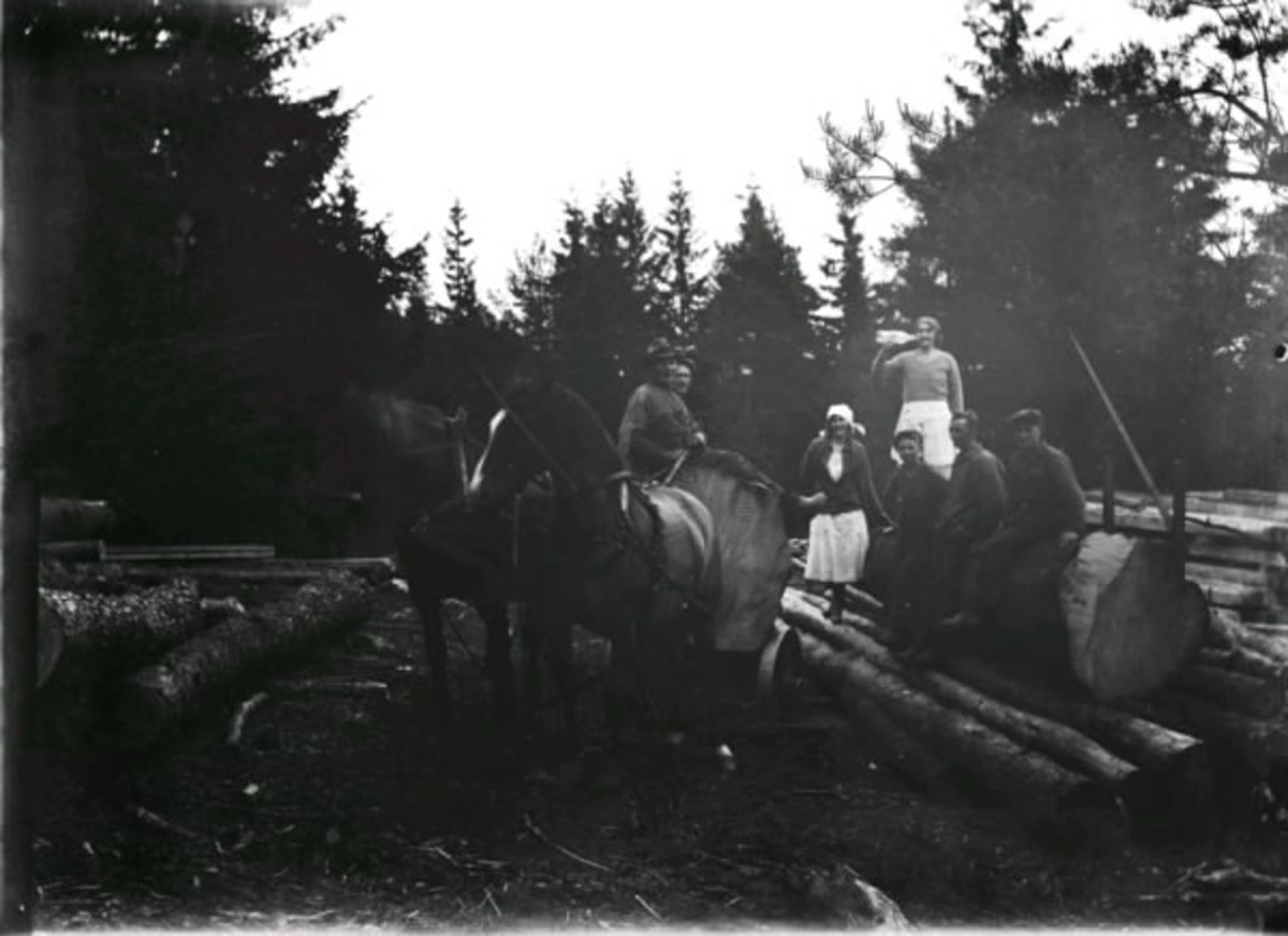 Sju personer arbetar i skogen med att transportera timmer med hästar. De flesta sitter på en bjässe till stock och en likadan ligger lastad bakom hästarna. Ena kvinnan håller upp en stor flaska så kanske det är en varm dag.