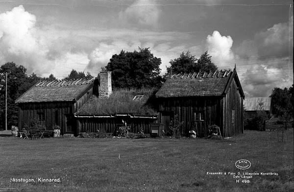 Vykort, "Ryggåsstugan Kinnared". Exteriörbild av en så kallad högloftsstuga med ryggåsstugan i mitten och två sidoloft. Själva bostaden var i stugan med ingång via loften Här har stugan fått ett takfönster men i sin ursprungliga form var enda ljusinsläppet via ett rökhål i taket. Här har byggnaden blivit en hembygdsstuga omgiven av träd, bikupa och trädgårdsmöbler.