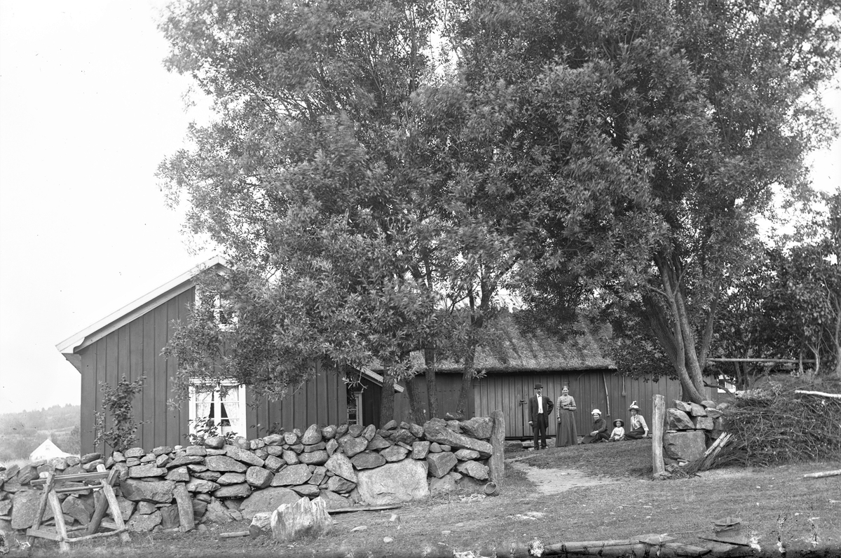 Gård i Veddige, möjligen Svinabacka. Vid muröppningen in till gården står två höga askar och vajar i vinden och under dem ses makarna i huset. Kanske är kvinnan och barnen som sitter bredvid gäster, eller barn och barnbarn. Till höger vid muren ligger en hög ris och färdiga risknippen och till vänster en korg.