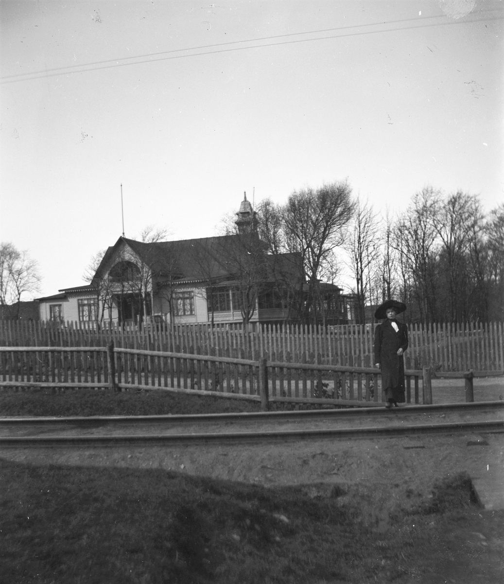En ung kvinna står med ena foten på rälsen som ledde tågen söderut från Varberg före 1920. I bakgrunden ses Societetsrestaurangens gavel och spjälstaketen längs grusvägen däremellan.