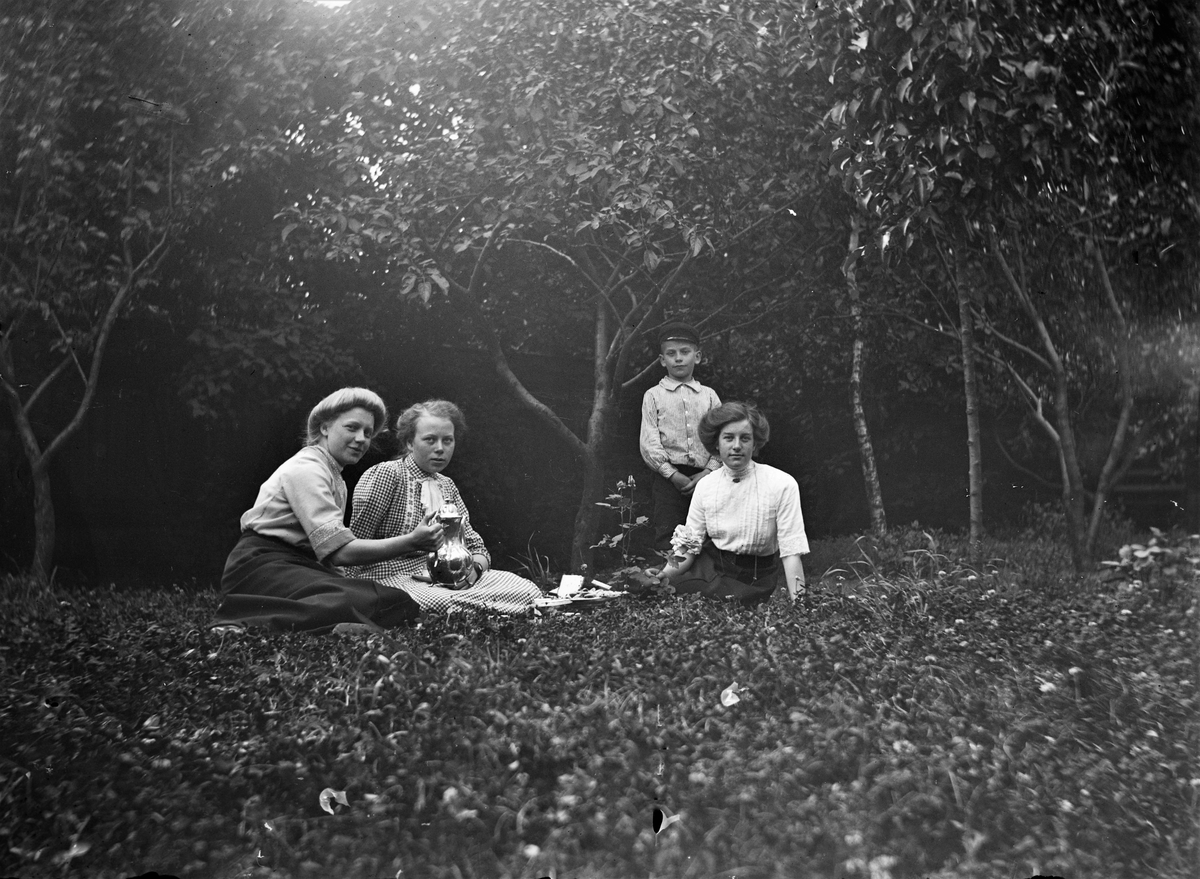 Tre unga flickor sitter i en trädgård vid en nyutslagen ros och ska dricka kaffe. Vid ett träd bakom dem står en liten pojke. De har med sig kakfat, porslingskoppar och en kaffekanna av metall.