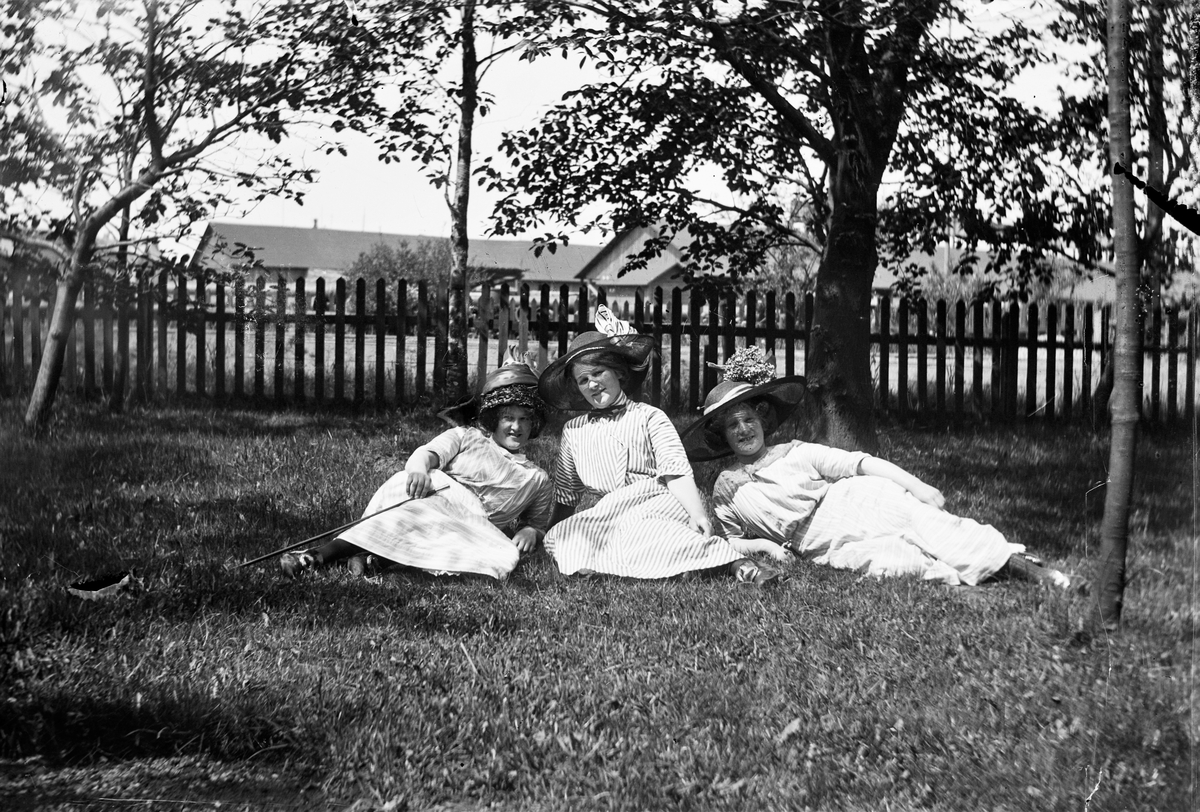 Tre unga kvinnor ligger i gröngräset, kanske i Varbergs Societetspark. Alla tre bär likadana skor med stora spännen, spektakulära sommarhattar och klänningar i olika randade tyger. Flickan till vänster har även en promenadkäpp. Parken hägnas av ett spjälstaket och i bakgrunden syns långa byggnader.