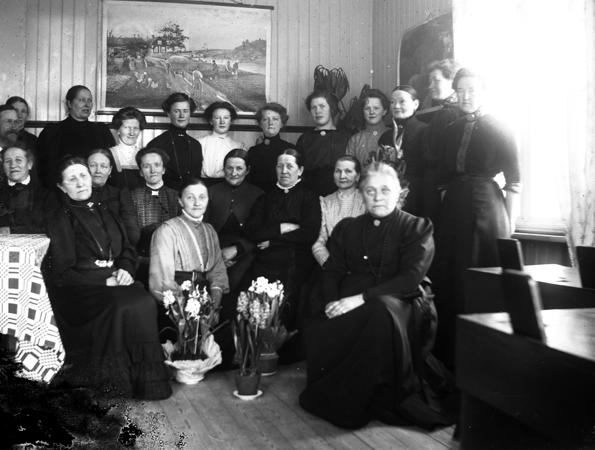 En grupp kvinnor och en man samlade i småskolan i Sällstorp. Kanske firas någon eller något då det står krukor med hyacinter och narcisser på golvet. Kvinnan som sitter närmast blommorna är Bertha Engström som undervisar i skolan. Hennes systrar sitter längst fram, Constance Engström till höger, som är folkskollärare i socknen, och Fredrika Engström till vänster. (Se även bild nr GEB273)