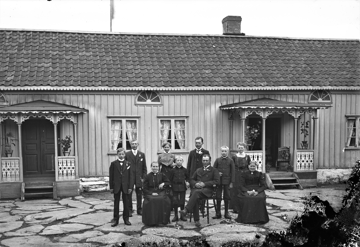 Folket på Marbogård Jannes, Sällstorp 6, är samlat på den stenlagda gården utanför mangårdsbyggnaden. De är mörkt klädda och flera av dem har blommor fästade på kavajslaget eller blusen. De äldre sitter på stolar och övriga står, från vänster ses Karl, Nils, Anna Britta, Johanna, Ivar, Johan, Aron på stolen, Elis, Berta och Johanna sittande.