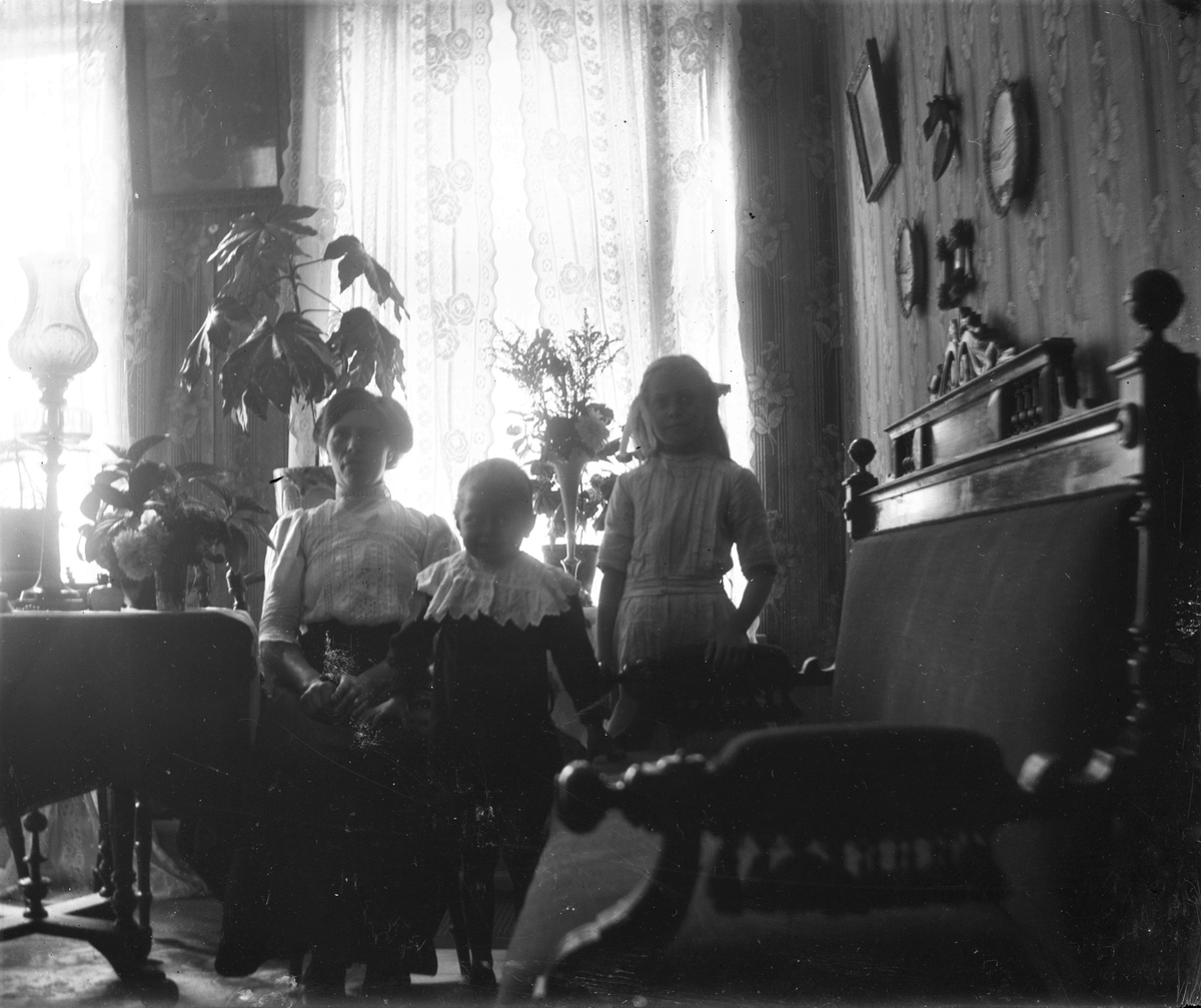Interiör med en kvinna och två små barn i motljus från salongens stora fönster. Rummet har högt till tak och randiga tapeter med stora blommor som går samman med gardinernas rosenmöster, krukväxter och blombuketter som pryder rummet. Möblerna bär sen 1800-talsprägel och på bordet står en hög, smal fotogenlampa.
