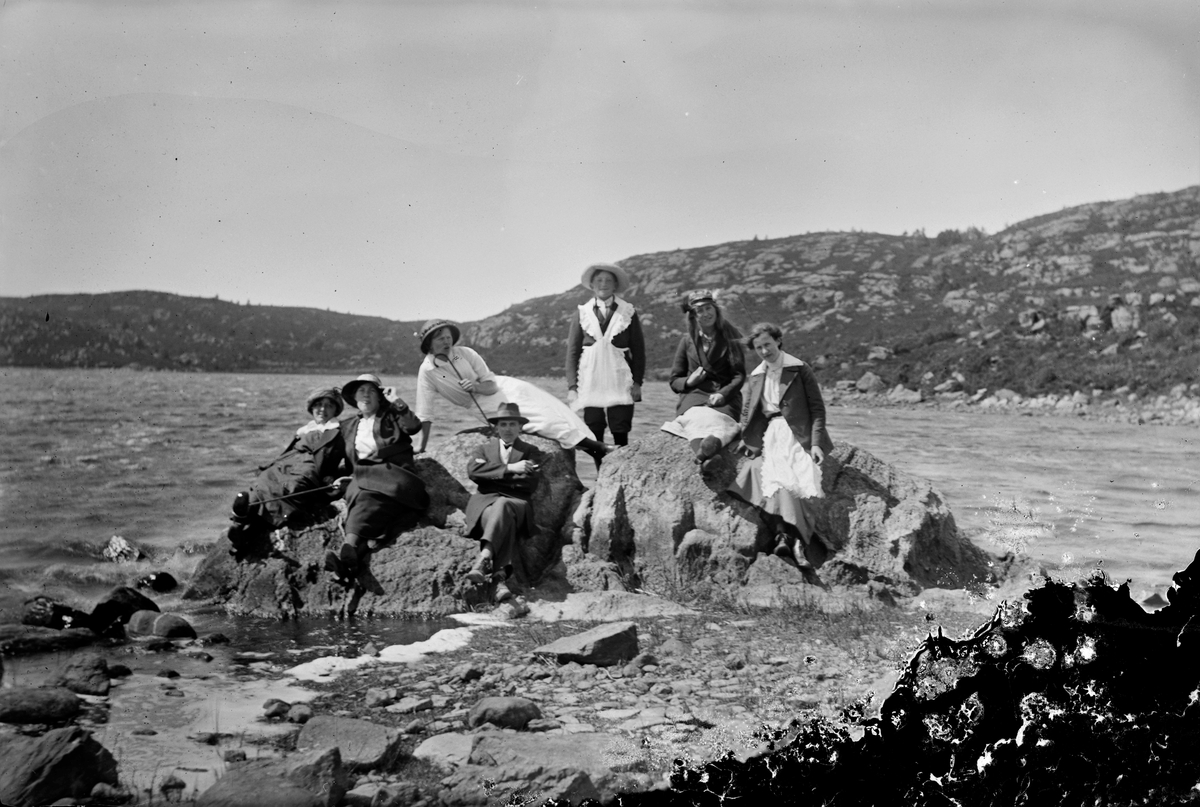 Sju personer spexar på ett par stenar i en sjö (Stamnasjön ligger i Sällstorp och i närheten även Hulta- respektive Deromesjön). Killen som står upp i mitten har dragit på sig ett förkläde ovanpå kavajen och bytt huvudbonad med kvinnan till höger. Hon har håret utsläppt, vilket inte var vanligt vid den tiden. Kvinnan som håller i hatten till vänster räcker ut tungan mot kameran och kvinnan ovanför henne intar en halvliggande pose med käppen mot hakan.