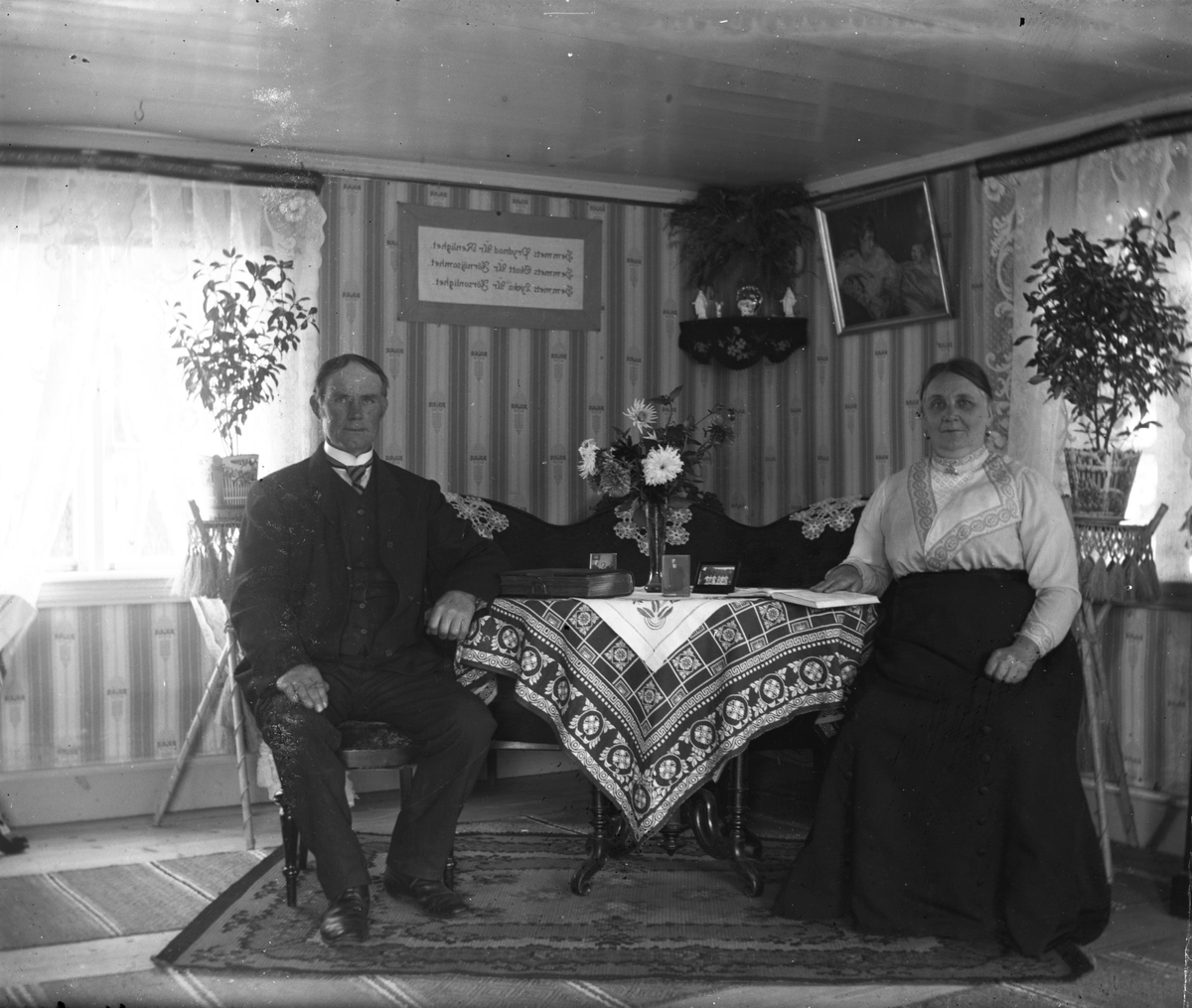 Syllinge, Jonasa i Veddige. Jenny och Johan sitter i finrummet vid bordet, där det ligger en kraftigt mönstrad duk. Soffan pryds av virkade antemarkasser och ovanpå trasmattorna ligger ytterligare en matta under bordet och stolarna där paret sitter. Bakom dem står piedestaler med krukväxter. Randiga jugendtapeter klär väggarna och av bonaden att döma är bilden spegelvänd.