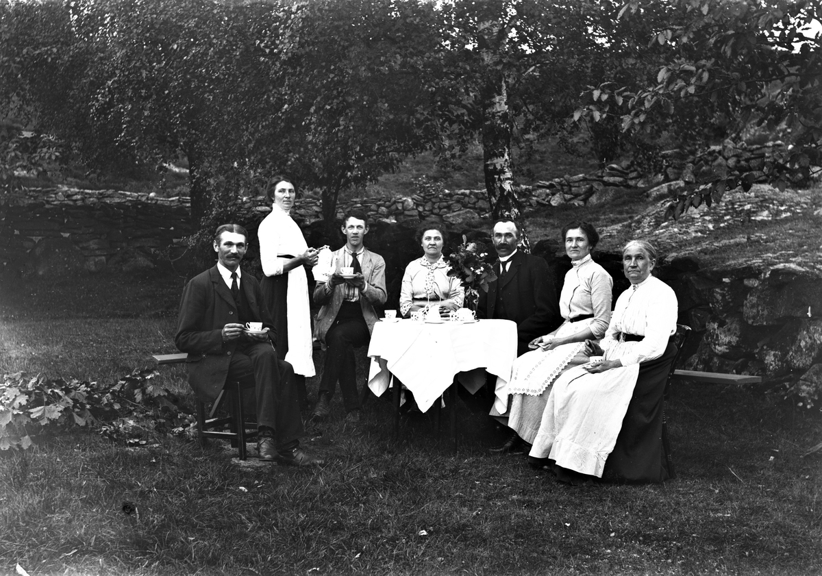 Här har fotografen själv, Gunnar Engström, för ovanlighetens skull tagit plats framför kameran. Han serveras kaffe av Julia på Kärskens i Grimmared och är klädd i bredrandig skjorta, smalrandig kavaj och kravatt. Gunnar har av allt att döma lämnat över kameran till gårdens dräng, som är med på andra fotografier som togs vid samma tillfälle. Till höger om Gunnar sitter Tilda, Birger, Hulda och Josefin. Mannen till vänster heter Axel. På bordet står ett välfyllt kakfat och en bukett i vas.