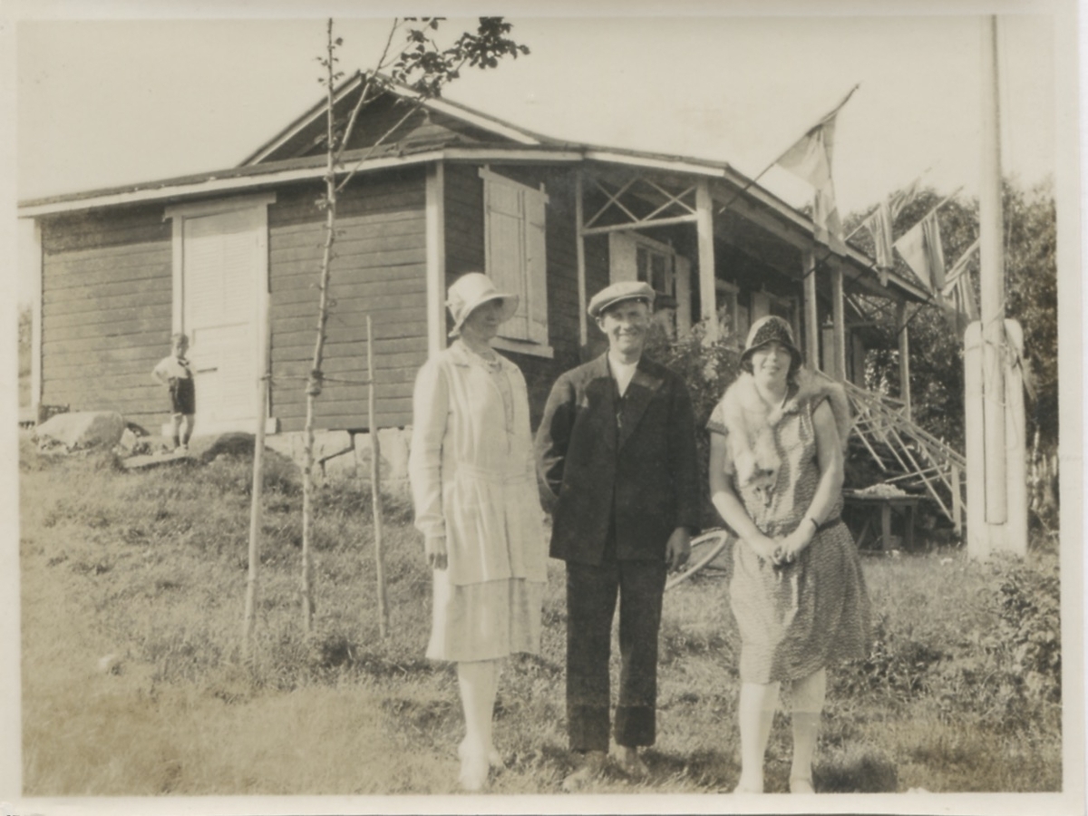 Två kvinnor och en man står framför en byggnad, okänd plats och årtal. I mitten står busschaufför John Johansson (1898-1966), Kållered Stom "Nygård". Damerna är okända. Även den lille gossen i bakgrunden är okänd.