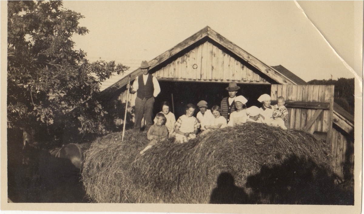 Höbärgning vid Labacka 1:2 "Lund" cirka 1930. Flertalet personer sitter/står på ett hölass.