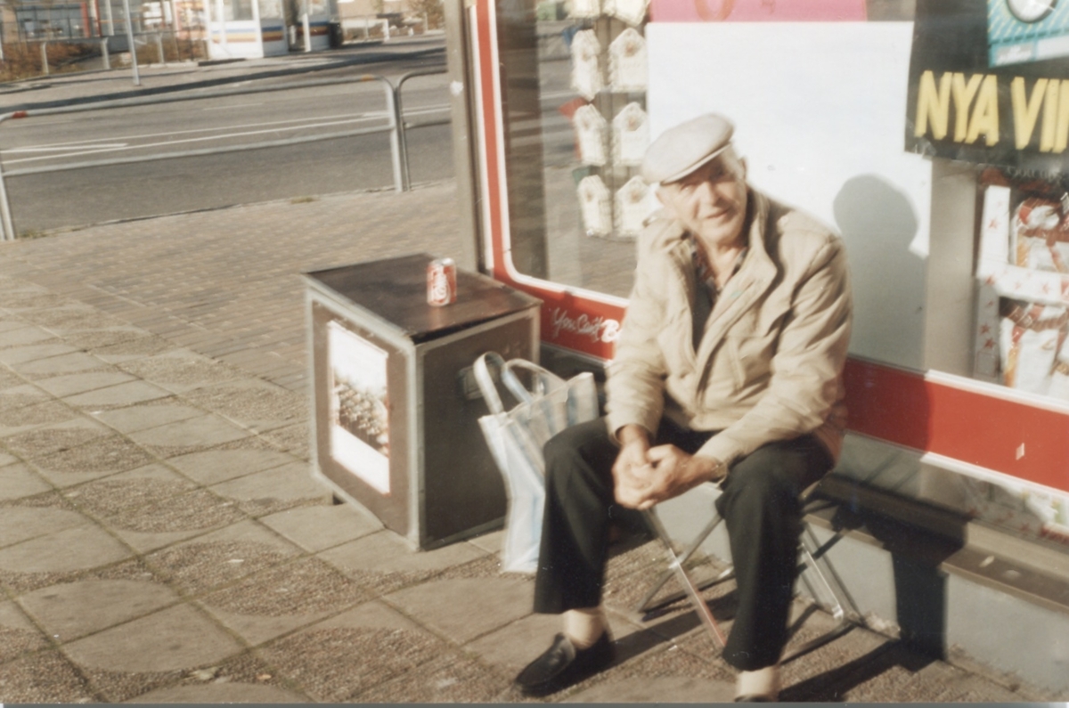 Knut Sund (1914-1998) sitter på en liten fällstol utanför Pressbyrån/dåvarande spelbutiken i Kållereds centrum cirka 1980-tal. I bakgrunden till vänster ses en vit busskur med blå/gul/röda ränder.
