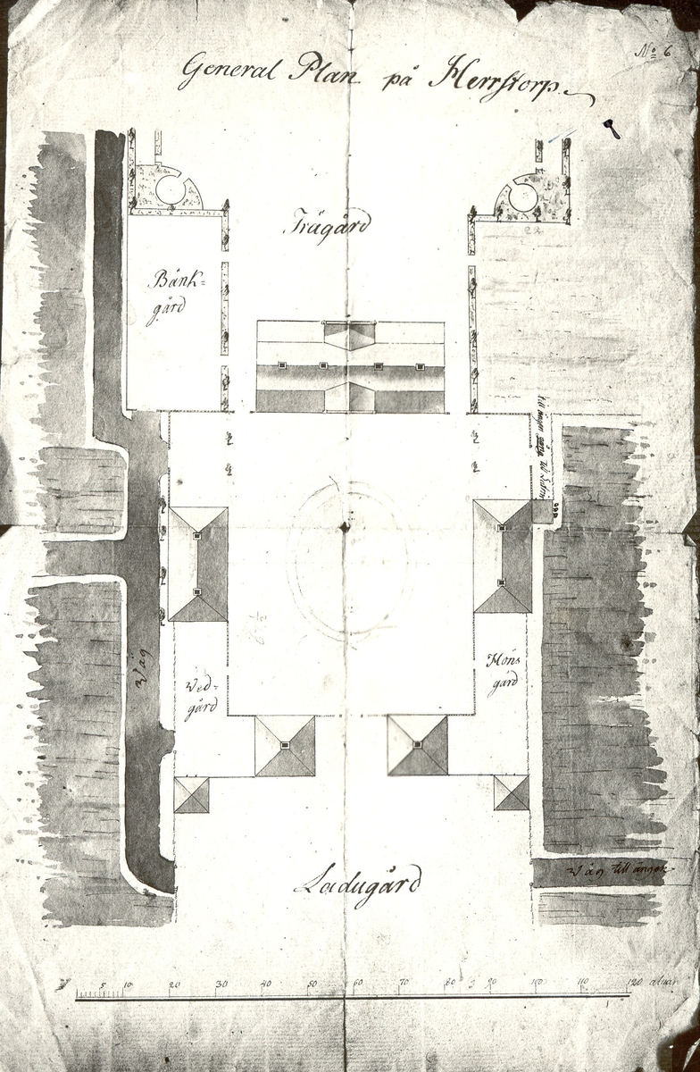 Herrestorps gårdarkiv. Generalplan av kunglig sekreterare Carl Jacob Drangel c:a 1800.
