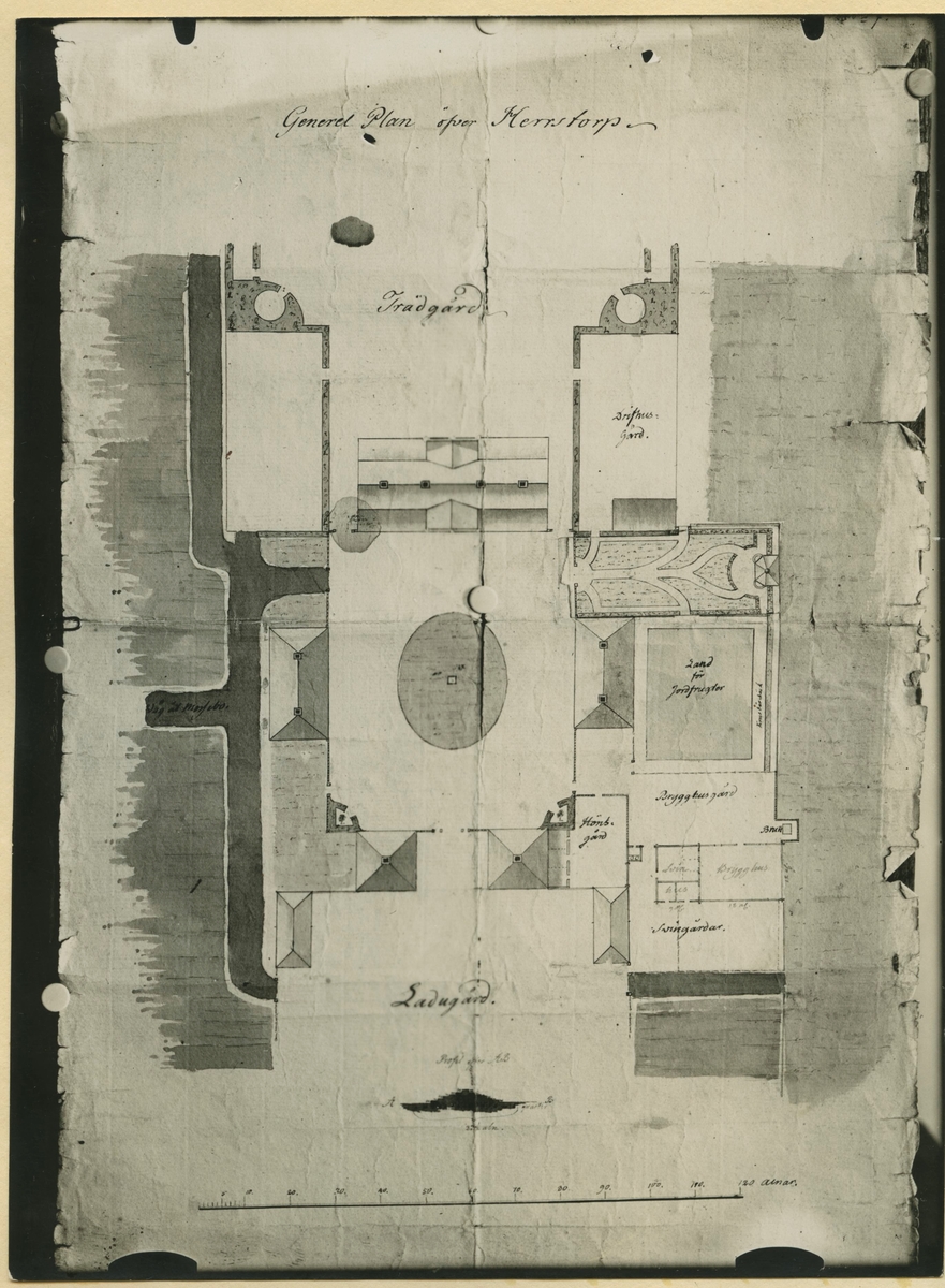 Herrestorps gårdarkiv. Generalplan över fransk park av kunglig sekerterare Carl Jacob Drangel c:a 1800. Kom till utförande.