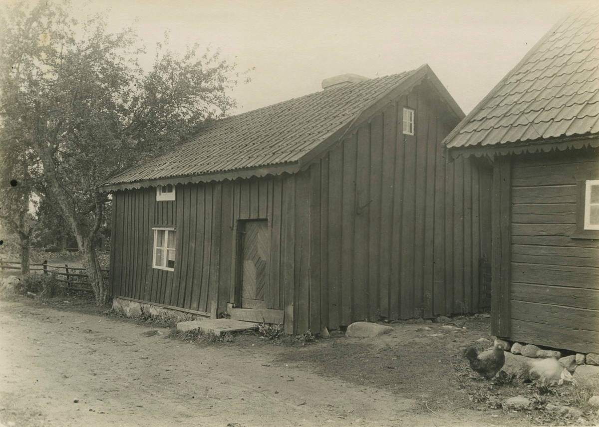 Drängstuga. Sadeltak på åsar. Knutar inklädda.