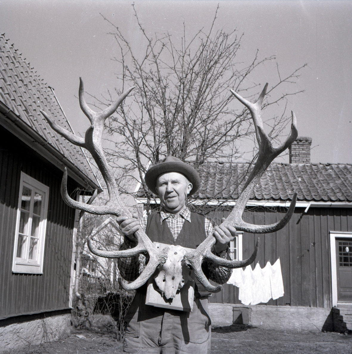 G E Bergkvist eller Lennart Bergkvist i Högsrum med Sveriges största kronhjortshorn.