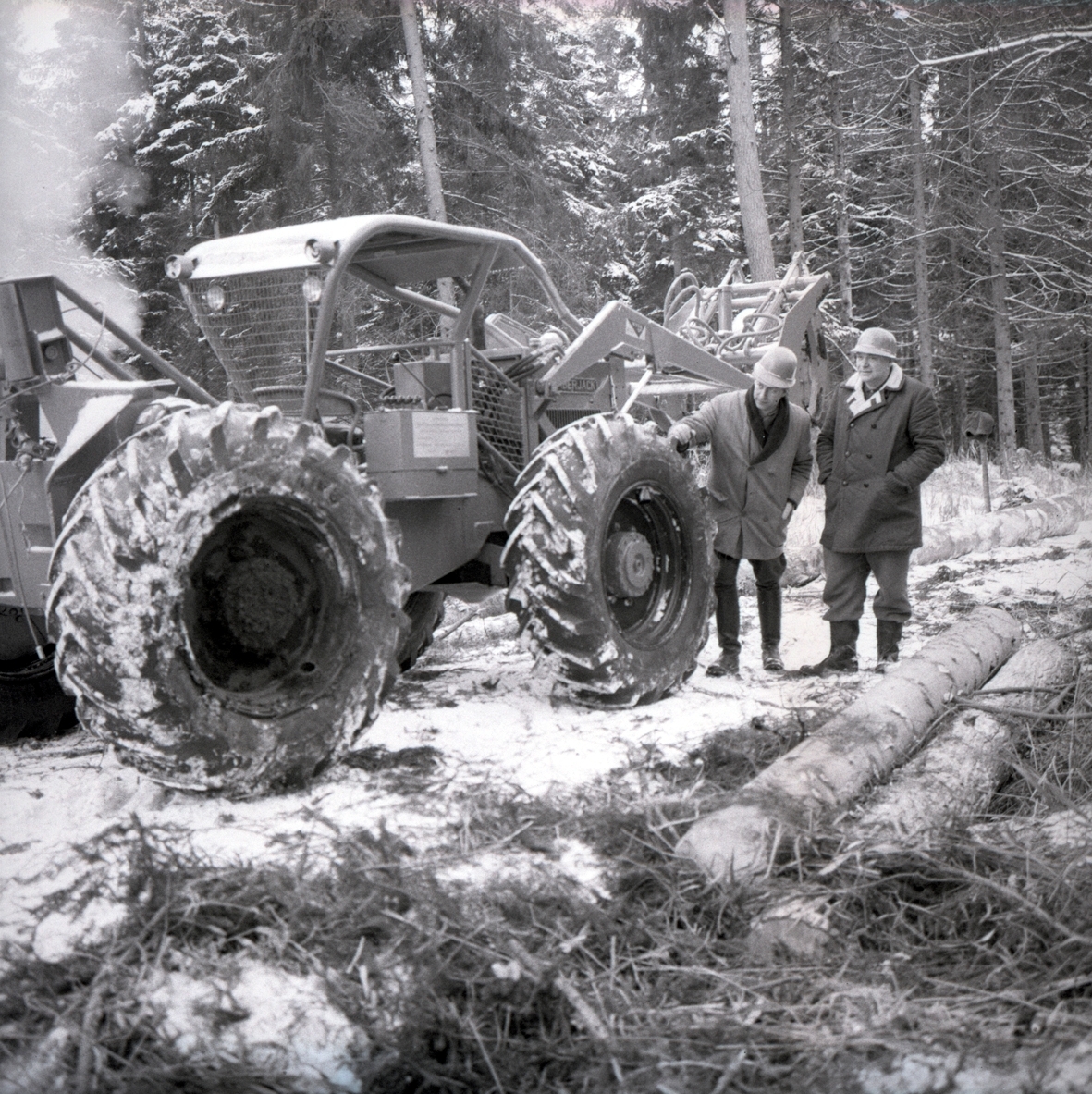 Titel: Skogsavverkning i Böda. Skogsmaskinen "Timber Jack" provkörs.