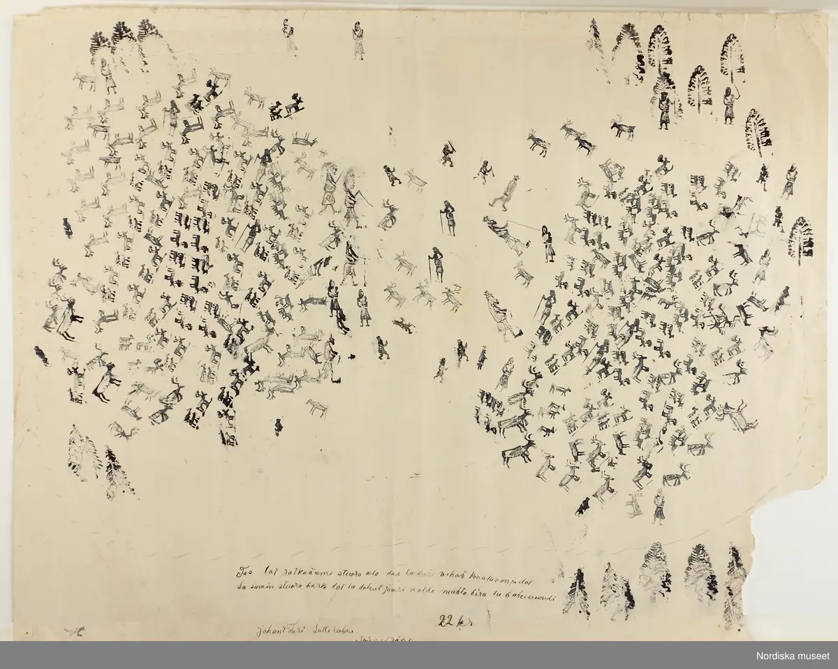 Teckning av Johan Turi. Renhjord och människor i arbete vid skogsbryn.