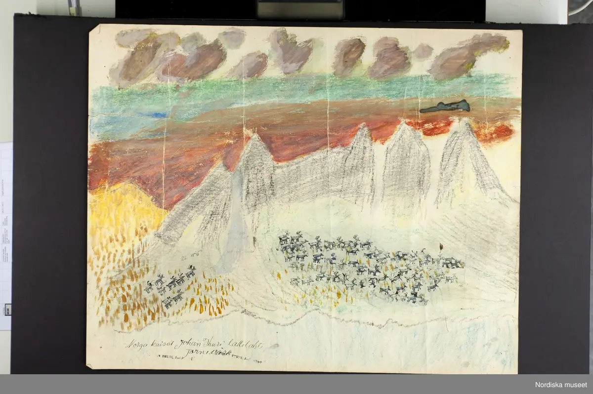 Teckning och akvarell av Johan Turi. Landskapsvy med renar på fjället.