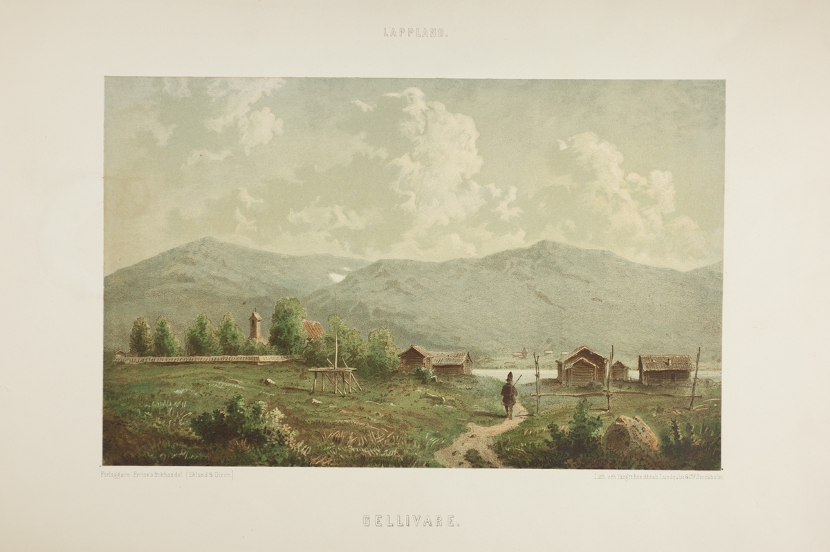 Färgtryck. Vy över fjällandskap med by och kyrka, en man går på en väg. Motivet "Gellivare" är hämtat ur Carl Anton Petterssons planschverk Lappland, dess natur och folk från 1866. L.A. 995. Jämför NMA.0103249.