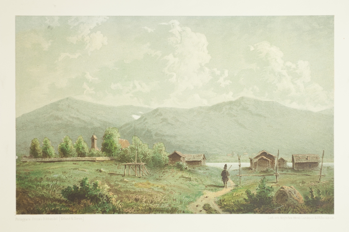 Färgtryck. Vy över fjällandskap med by och kyrka, en man går på en väg. Motivet "Gellivare" är hämtat ur Carl Anton Petterssons planschverk Lappland, dess natur och folk från 1866. Jämför NMA.0103174.